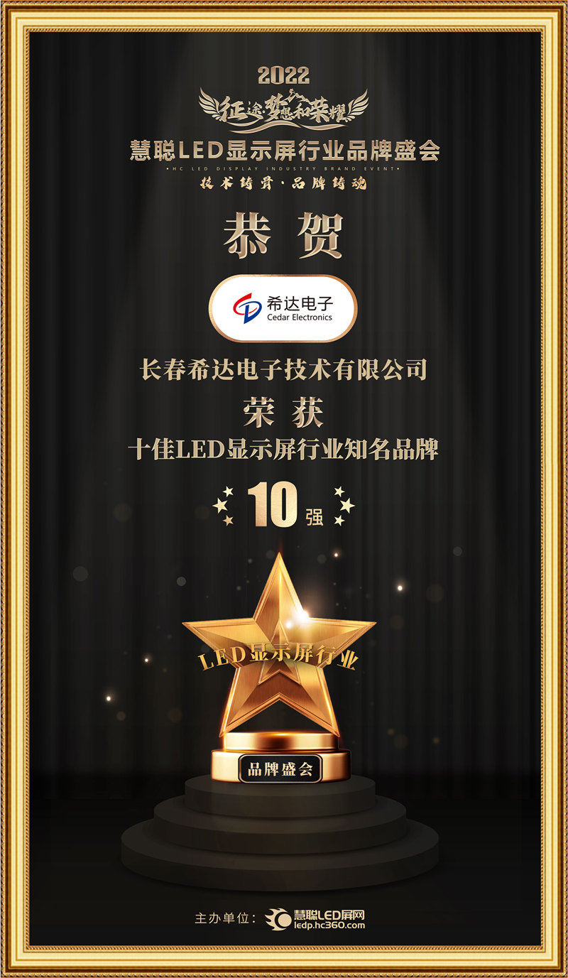 12月2日, 2022年度慧聰LED顯示屏行業品牌盛會十佳品牌評選結果重磅揭曉。希達電子再登榮譽榜單并憑借強大的品牌影響力和技術創新力斬獲本年度“十佳LED 顯示屏行業知名品牌”、“十佳LED超高清顯示及新型顯示應用屏”兩項大獎,希達電子以硬核科技實力詮釋匠心智造擔當,賦能LED顯示行業創新發展。